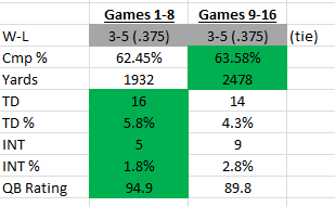 Yes, his completion percentage was 1% higher in the 2nd half of the season as compared to the first half, and he did throw for more yards in the last eight games than in the first eight. But, in every other major category, Manning's performance declined--and he had identical 3-5 records in each half of the season.
